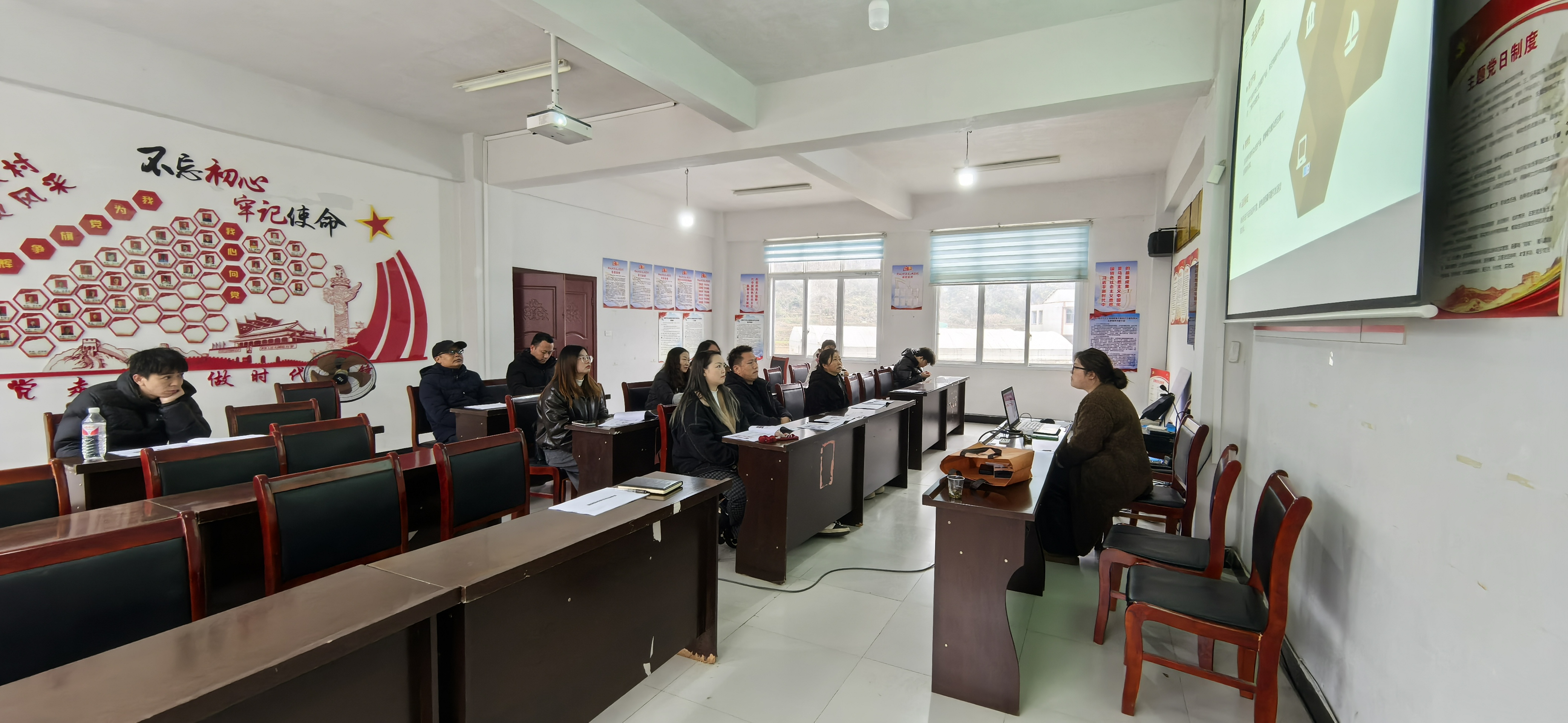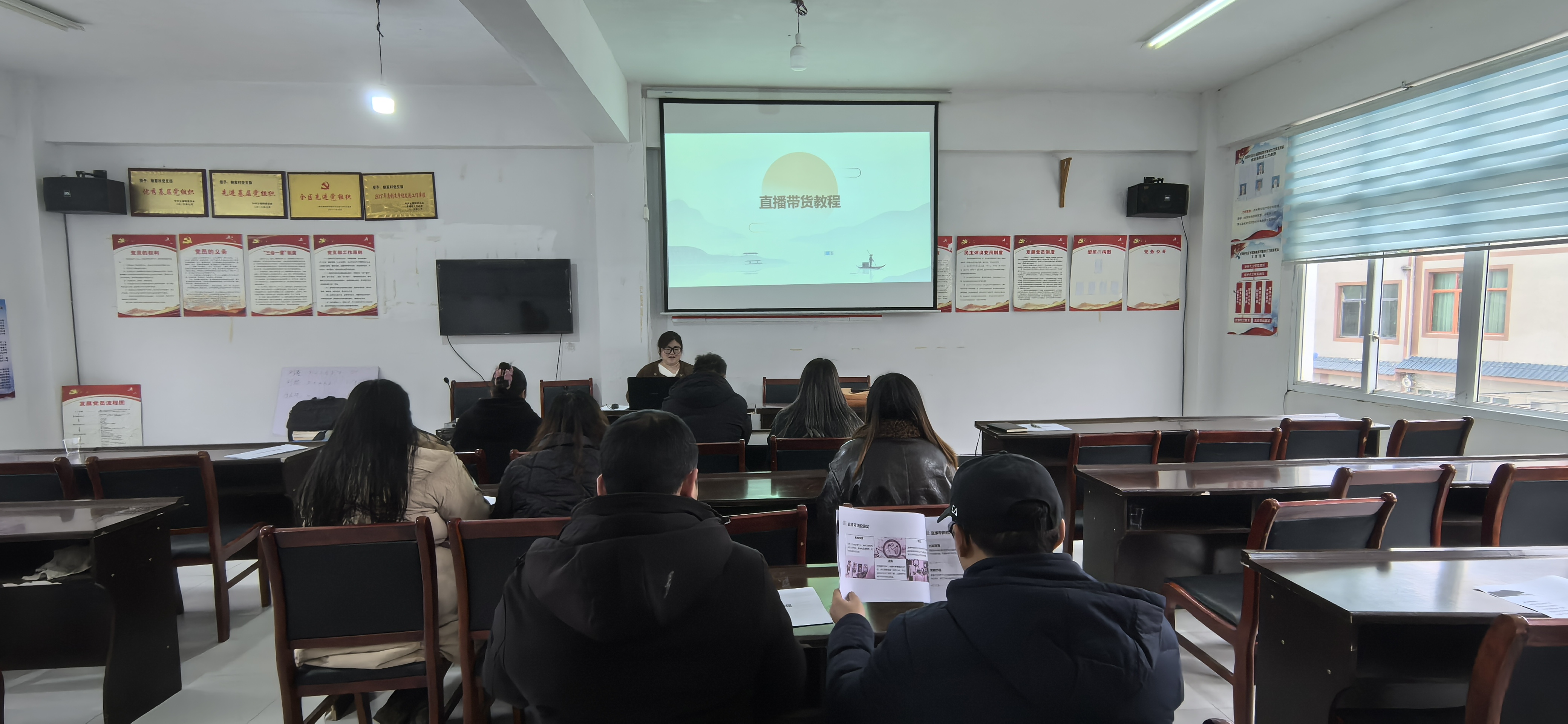 培训现场,讲师通过图文并茂的PPT课件,围绕直播带货的全流程展开细致讲解。内容涵盖平台操作、内容策划、互动技巧、物流售后等关键环节,注重理论与实践结合,帮助参训人员逐步构建直播运营的完整知识体系。约20名参训人员——包括鲍家村村支两委成员、有意从事直播的在家青年及普通村民,除了理论讲解,培训还进行了实操演练,让参训人员切实体会当“网红”、直播带货的新体验、新感受。