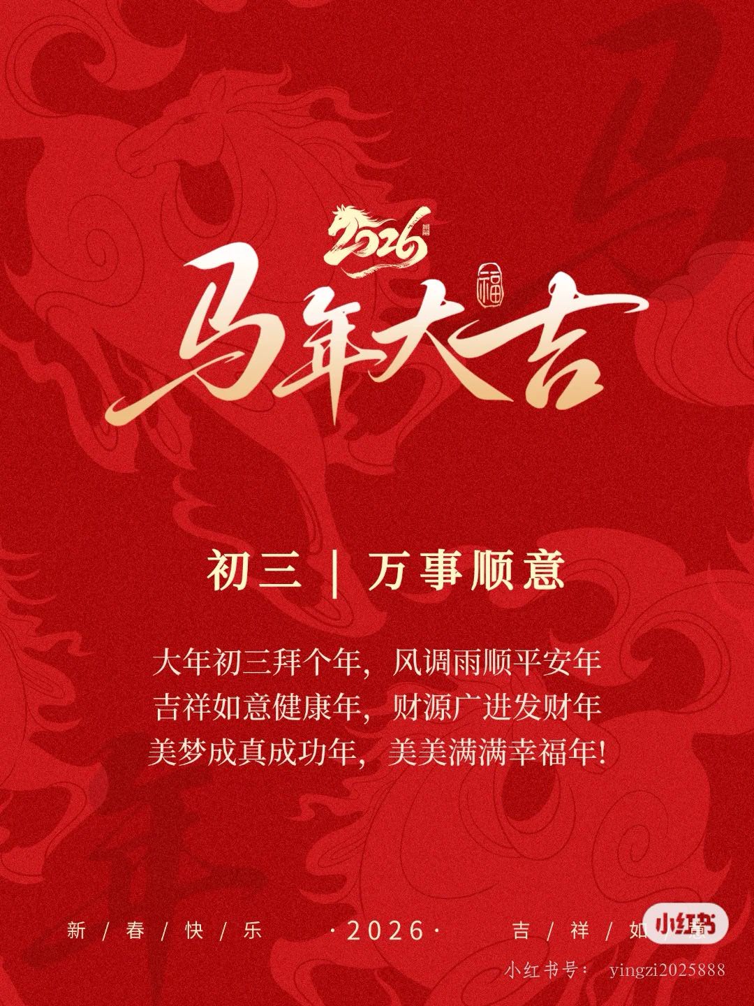 大年初三拜个年,风调雨顺平安年,吉祥如意健康年,财源广进发财年,美梦成真成功年,五谷丰登丰收年,祝你美满幸福年。